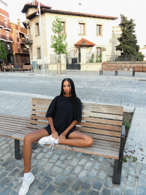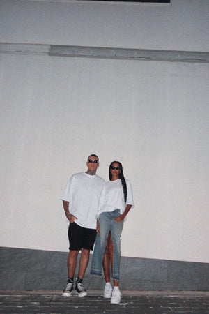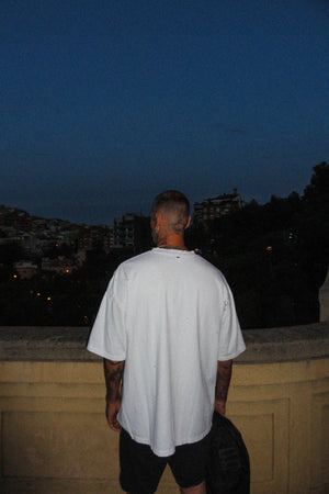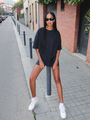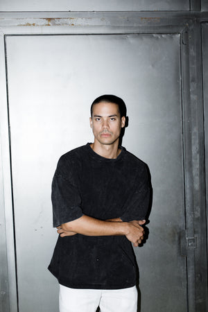 The Distressed Boxy Tee is cut from heavyweight soft cotton-jersey and finished with a vintage wash for a lived-in look. Featuring an oversized, boxy silhouette with elbow-length sleeves, this tee is detailed with hand-made holes and rips throughout, each piece revealing subtle flashes of skin and carrying its own unique character. No two are the same.