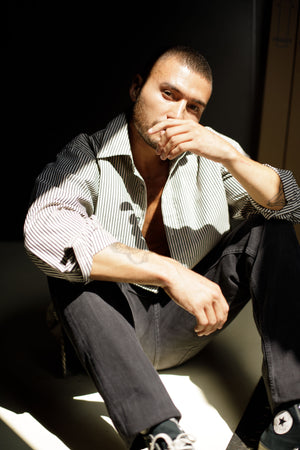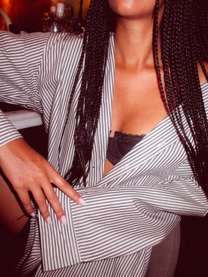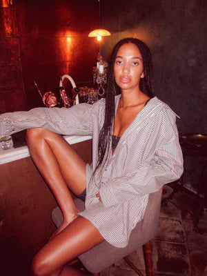 Made from lightweight cotton printed with slim dark grey stripes, this shirt has a slightly oversized fit and a pointed collar.